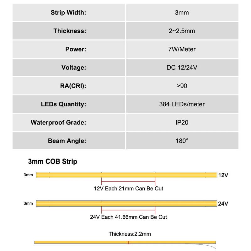 The Ultra Thin FOB COB LED Strip Light 3mm is a high-performance lighting solution designed for sleek, modern, and space-saving illumination. With a super fine 3mm width, this flexible 12V LED ribbon provides seamless lighting without visible dots, making it perfect for ambient lighting, backlighting, and decorative applications. Whether you need subtle lighting accents for cabinets, shelves, staircases, or automotive interiors, this LED strip light 3mm delivers consistent brightness with excellent energy efficiency.