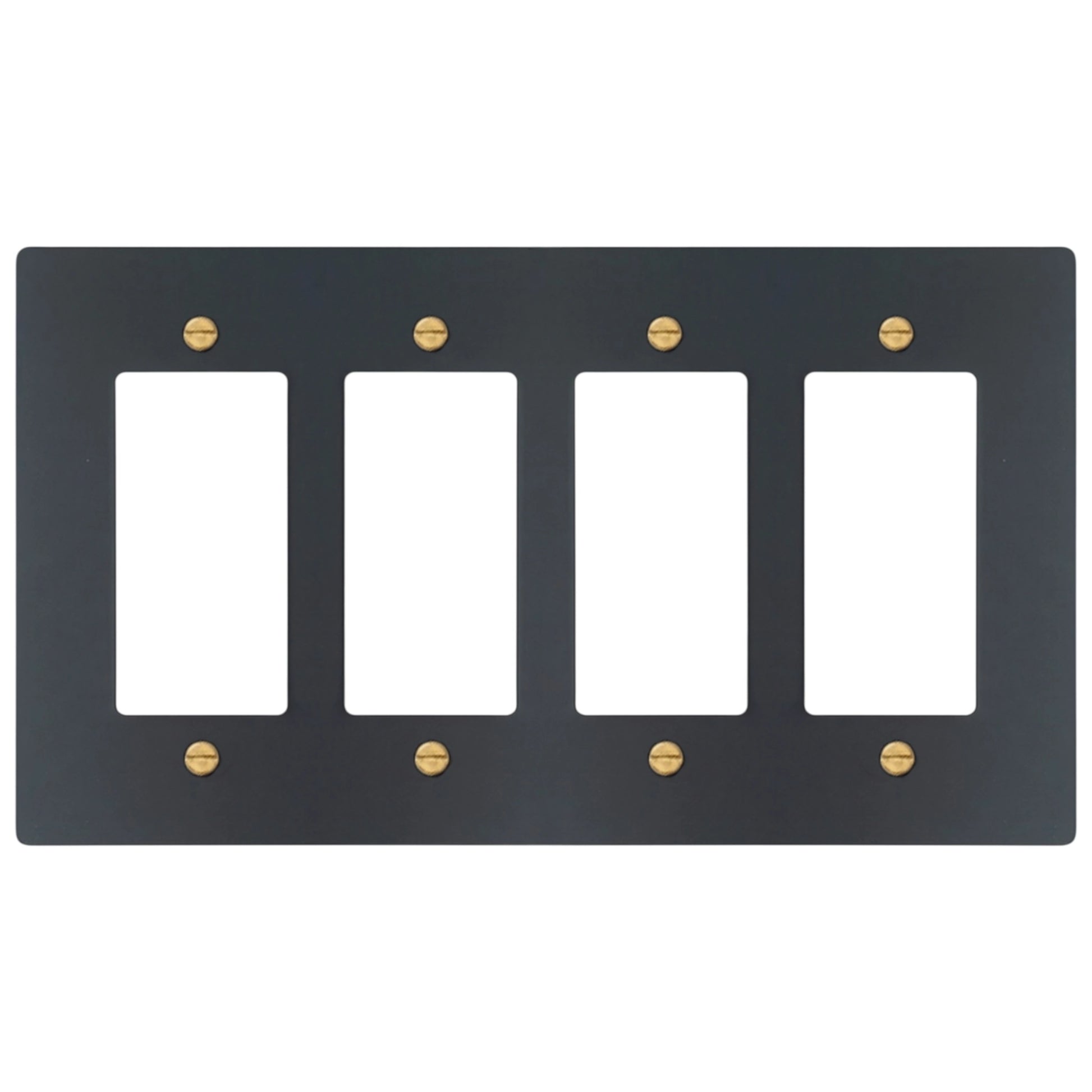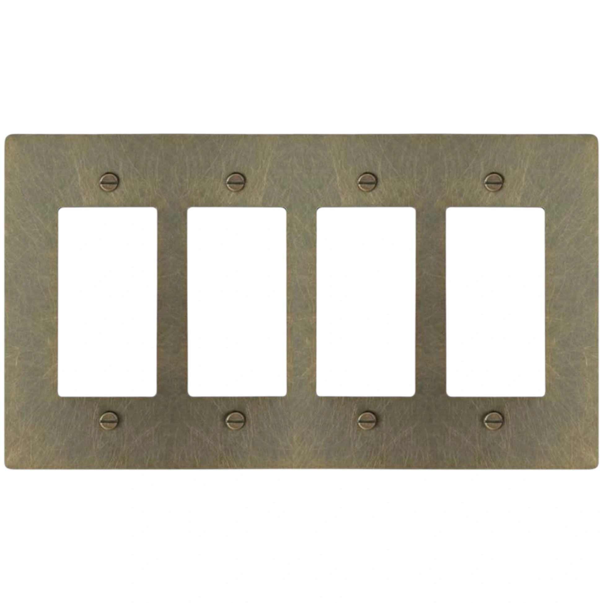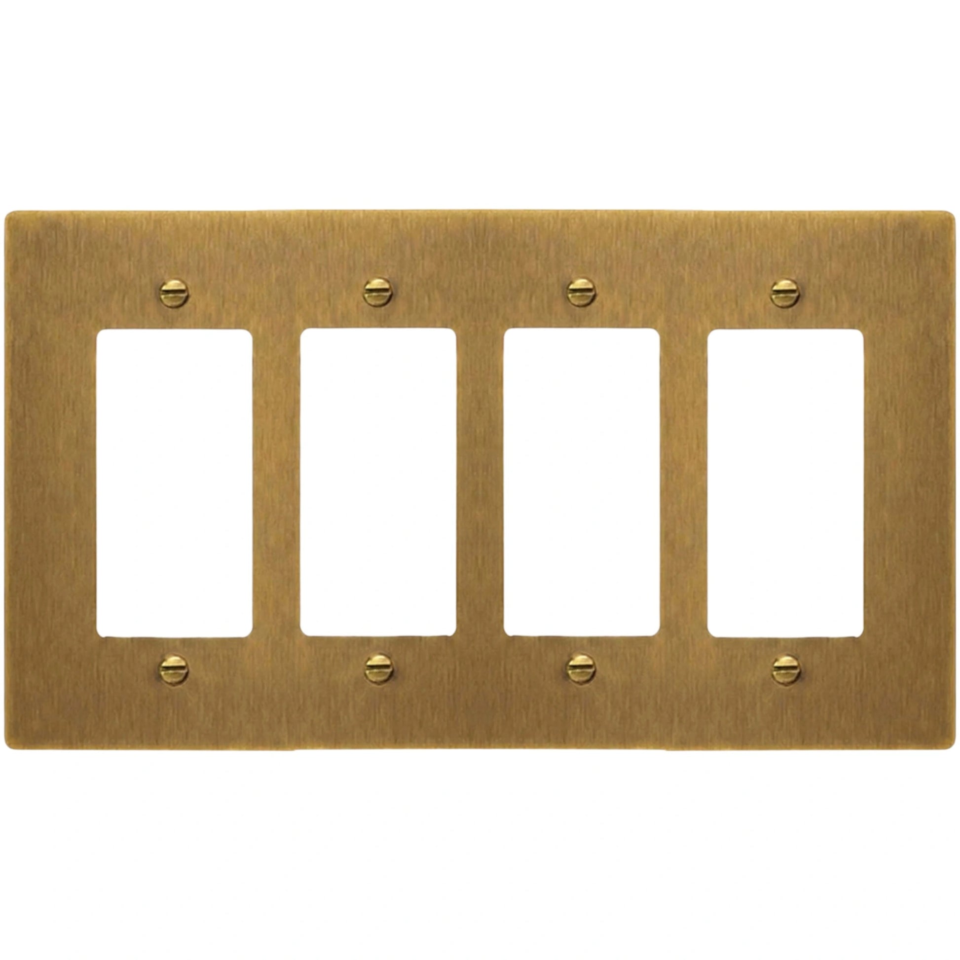 This 4-gang solid brass decorator-style wall plate fits standard decorator-format devices, including rocker switches, GFCI outlets, USB outlets, dimmers, and most smart switches. It’s cut from thick 0.080″ brass (not plated), then finished by hand so it looks clean and architectural once it’s on the wall. Matching screws are included.